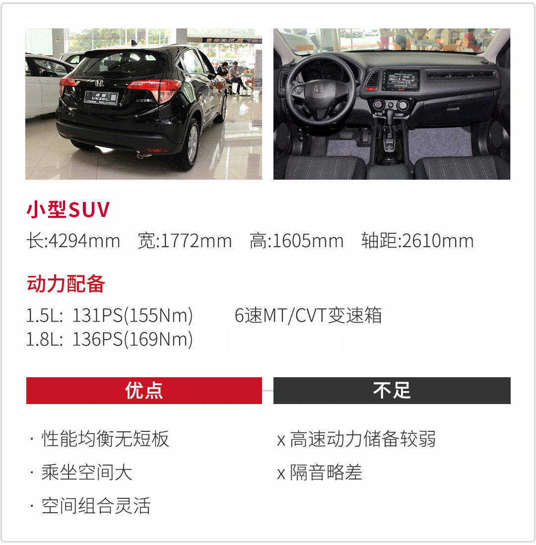 而且1.5L、1.8L两款发动机的功率表现不错,CVT变速箱也调校得比较灵敏,所以在市区行驶时相当轻快,开起来富有活力!它在动力性能和油耗方面表现出色,空间表现也可圈可点,只是中低配车型的配置不算丰富,但凭借它的几大卖点,还是能称为一款热销的入门SUV车型!