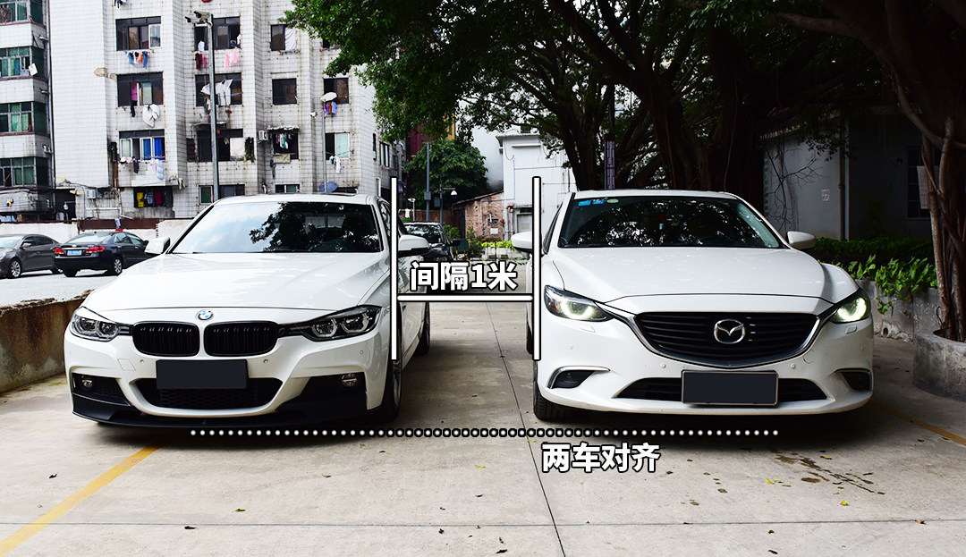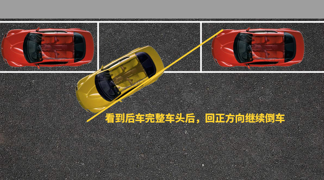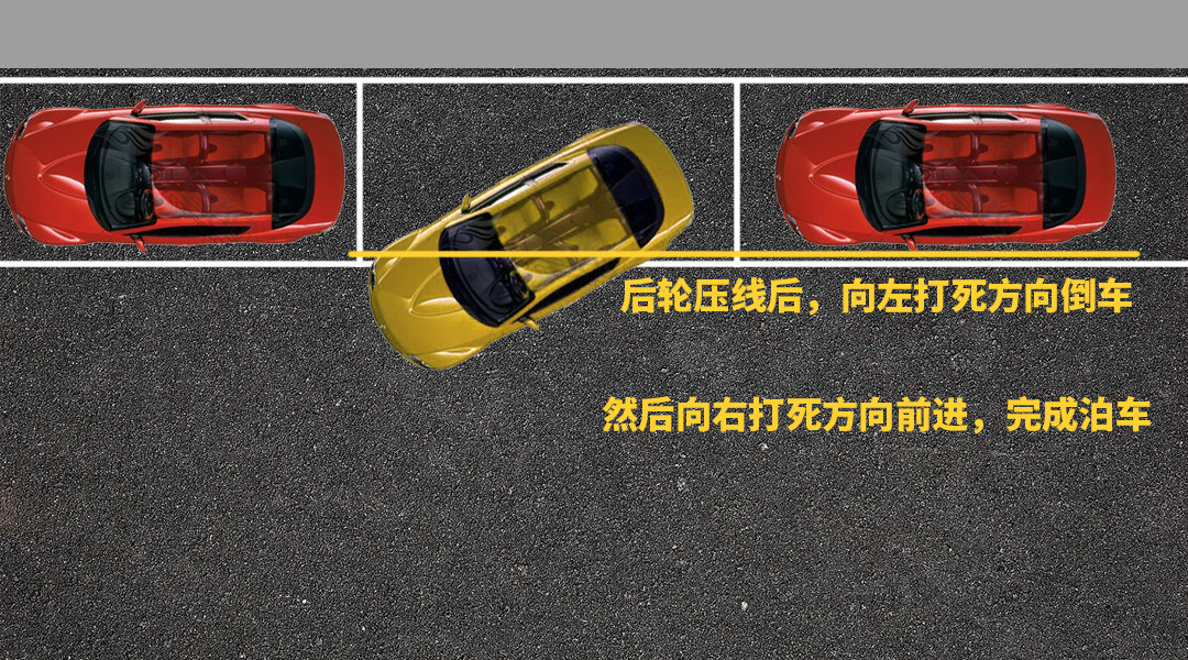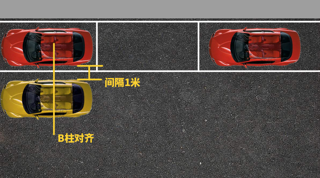 步骤1:停车至与前方车辆对齐(自己的B柱刚好对齐人家车的B柱),然后向右打死方向,倒车。
