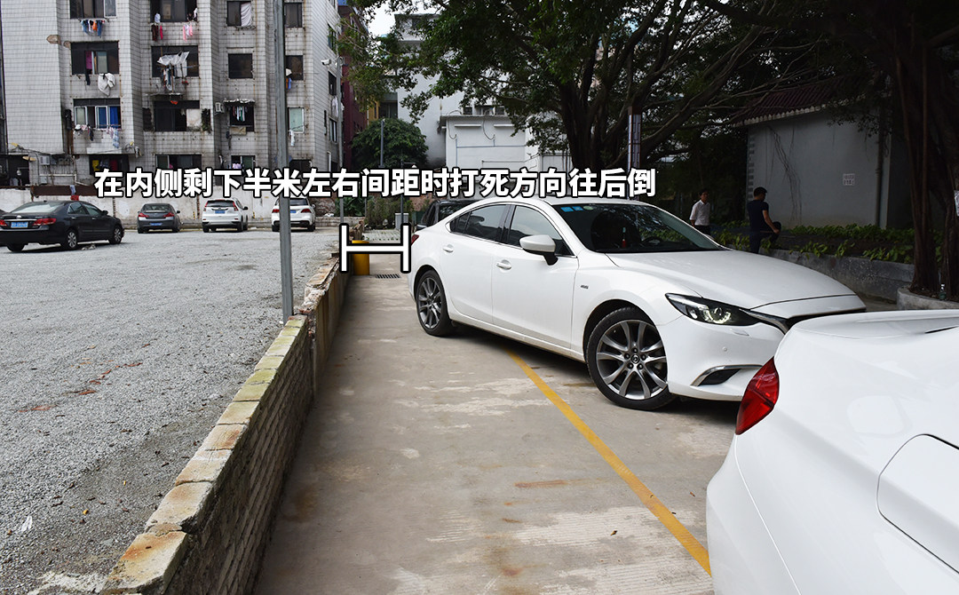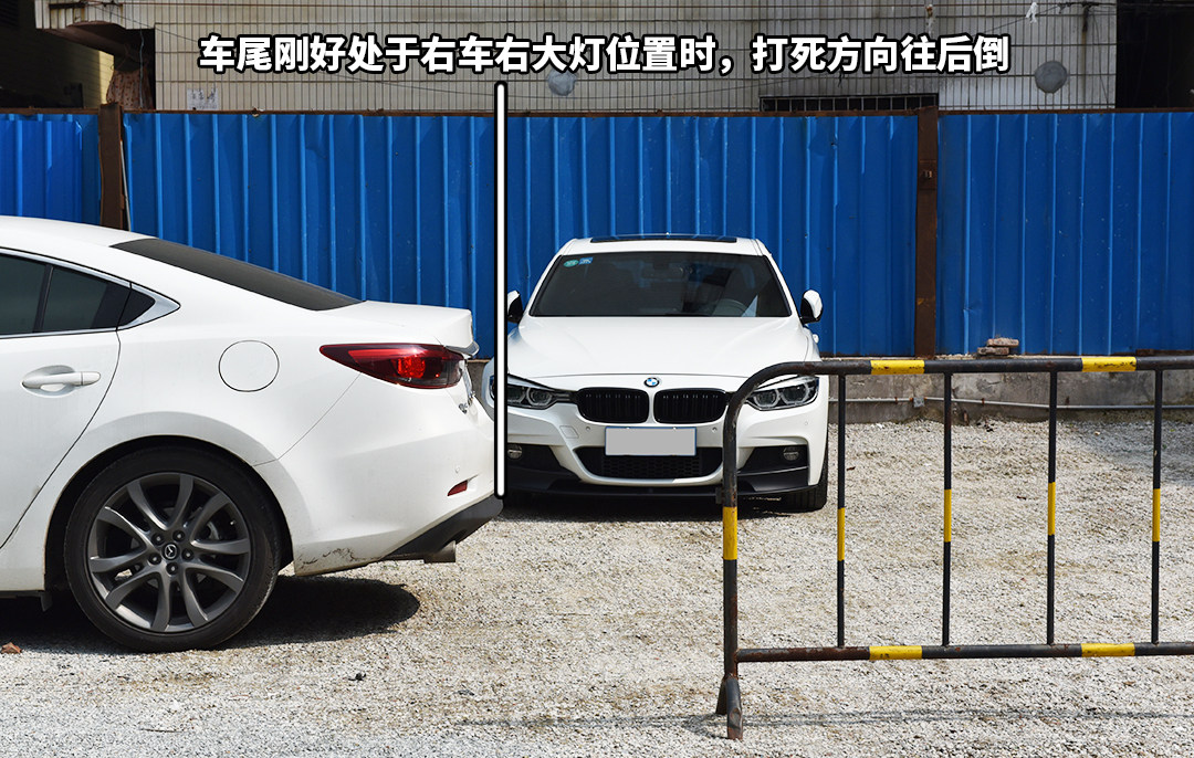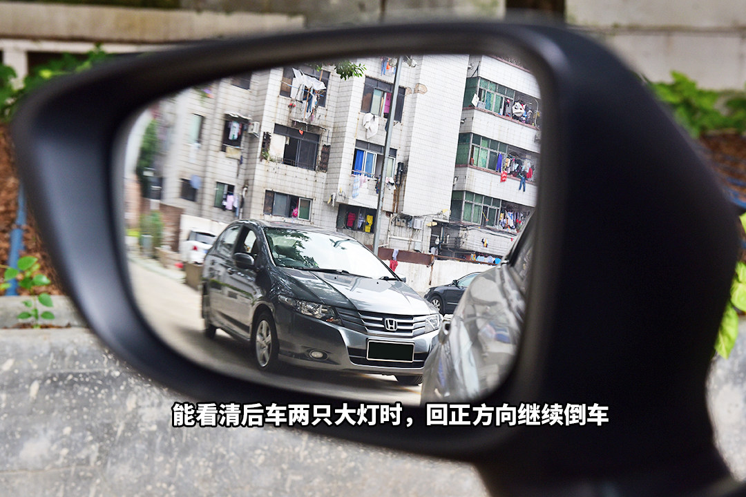 步骤二:倒车至可以看到后车的2只大灯时,回正方向,继续倒车,等自己的车右后轮距离路边只有1米左右时,往左打死方向,继续倒。