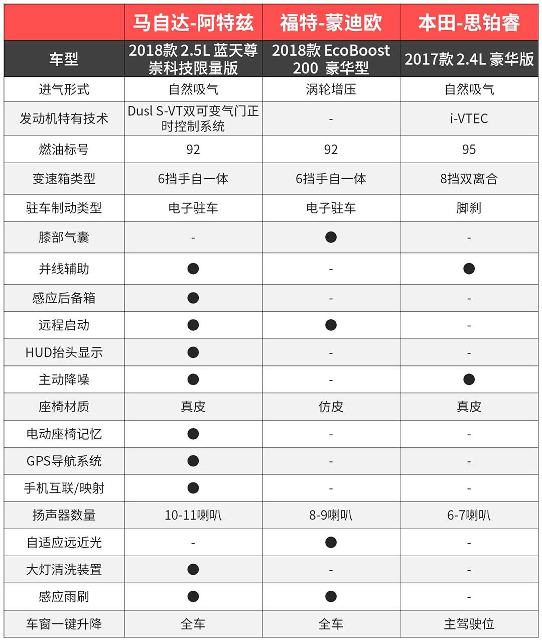 那么这几款车,哪个配置的最值得入手呢?阿特兹,选择2.5L蓝天运动版性价比是最高的,在保证足够的动力的前提下配置也足够我们日常所需;而蒙迪欧则可以考虑到1.5T的时尚型,动力能满足日常所需而且在配置上也能满足需求;最后轮到思铂睿,虽然2.4L版本更值得推荐,而且已经自带了原来的SI运动包围,但据消息称2.4L版本已经开始停产,而作为主销车型的实则为2.0L的低排量版本以及混动版本,而教授更推荐考虑混动版本。