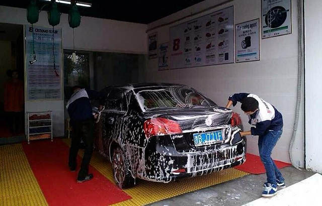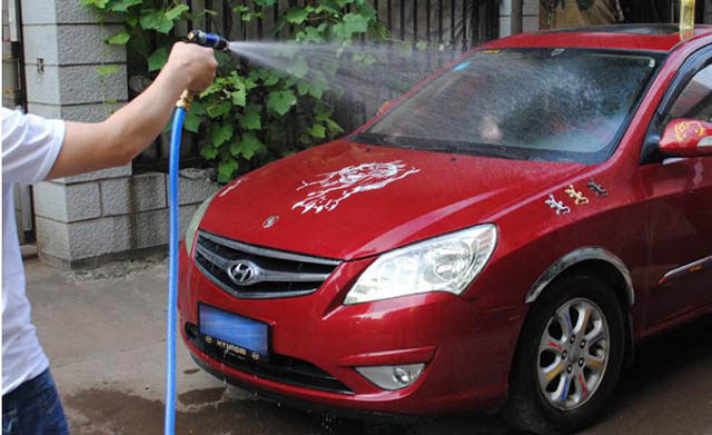 1.刚开始洗车的时候,最好用高压水枪把尘土冲刷掉,记住水压别太大,出水别太集中,以免伤害漆面。没有水枪的车主,可以用软布轻轻把沙土擦拭干净,预清洗步骤很重要。