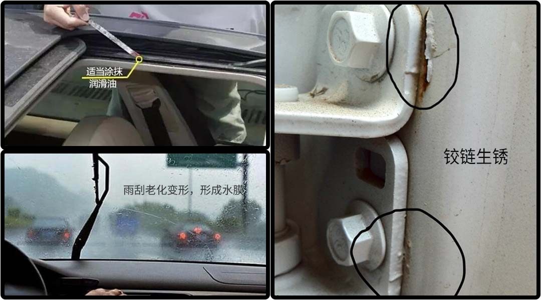 汽车的密封性再好,还是会存在缝隙的。雨水无孔不进,长期浸泡,部分零件会因此腐蚀生锈,降低使用寿命。开关车门时会发出异响;天窗密封条受雨水影响容易老化,出现渗水迹象。天窗导轨润滑油被冲洗,引发天窗开启关闭不严,轨道上运行不畅顺;雨刮老化变形,与挡风玻璃间隙过大,刮水时容易形成水膜,刮水不净影响雨中行车安全。