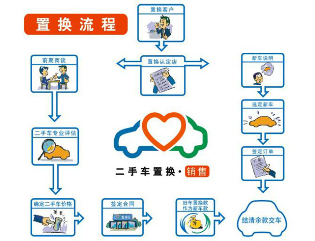 以上就是教授盘点的一些在二手车交易市场容易遇到的问题,希望对各位看官有所帮助。当然了,最后教授再啰嗦一句,各位看官要想置换二手车辆,最好还是到正规的二手车市场或者公司去办,毕竟这些地方的交易流程、制度都更明确,车辆也具有更高的质量保障。最后附上正规二手车置换交易的图表