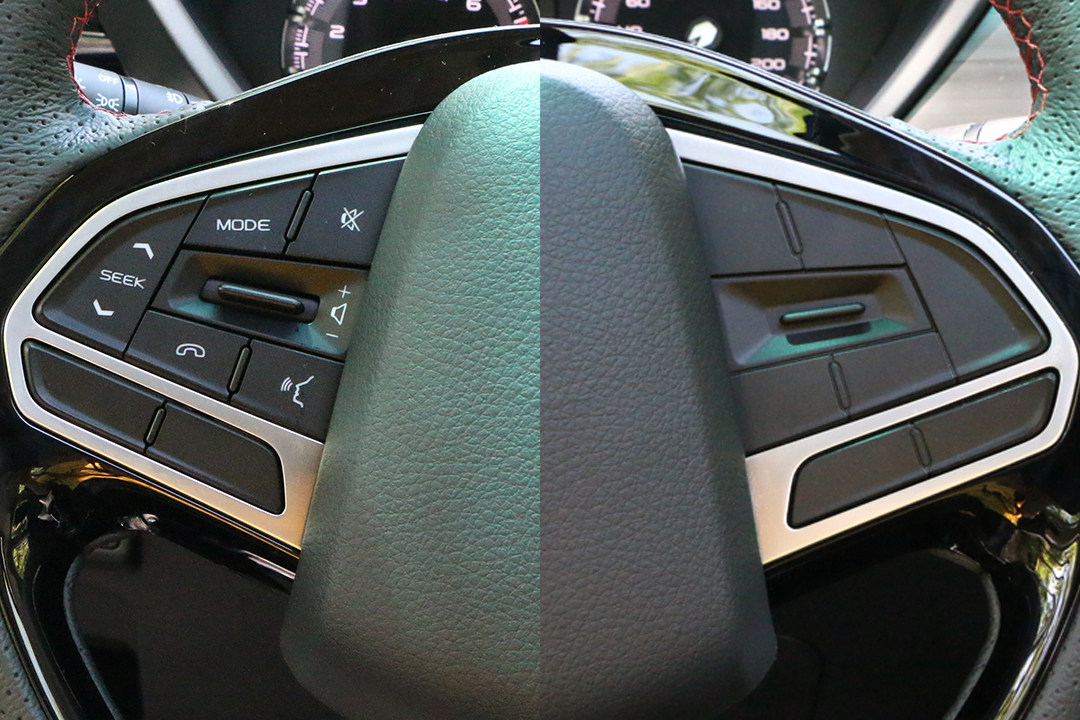 整个内饰最吸睛的地方是方向盘,两辐式设计的方向盘尺寸不算小,但是会感觉有点奇怪,喇叭盖板是从下往上包,而不是一般的从上往下,而且整个设计形状有点别扭,需要一点时间去适应,具介绍称整个形状调转一百八十度就是跟中控面板的形状一致的,好像是这样,但是打满一百八十度的感觉会更怪,这算是个彩蛋?设计师很皮。