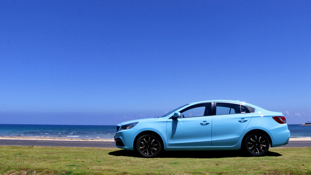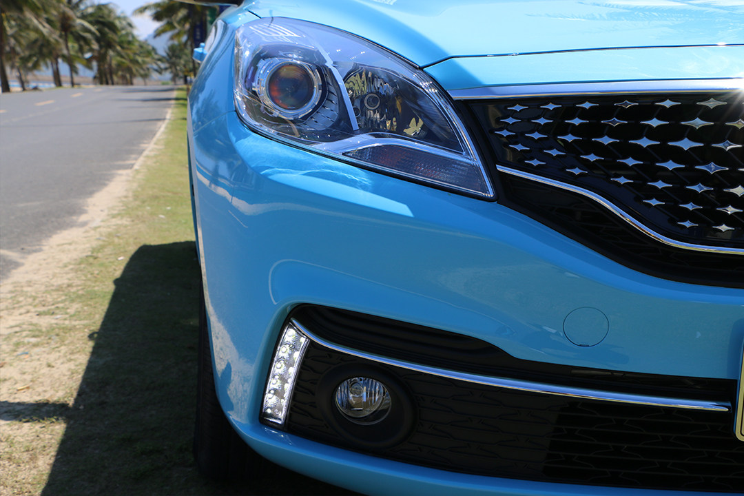 教授个人觉得侧面是F5最大的看点,上腰线断开若隐若现,下腰线一直延伸至尾部,非常有动感,特别是宝蓝色的车色,特别骚,配合三亚蓝天、蓝海、蓝车,完美。