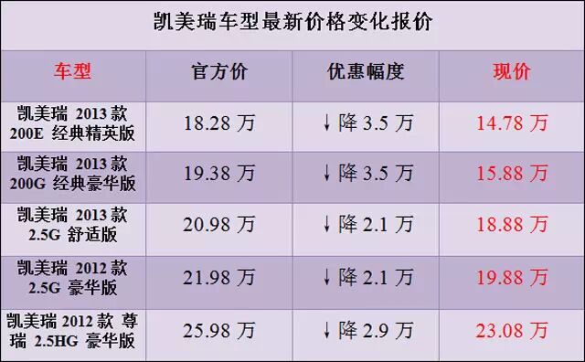 近日,从广州地区了解到,凯美瑞可优惠3.5万元。以下是具体价格信息: