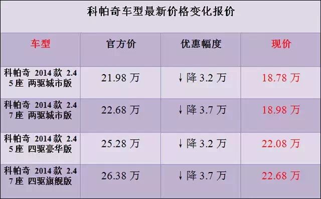 近日,从广州地区了解到,科帕奇可优惠3.7万元。以下是具体价格信息: