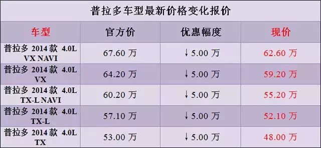 近日,从广州地区了解到,普拉多可优惠5万元。以下是具体价格信息:
