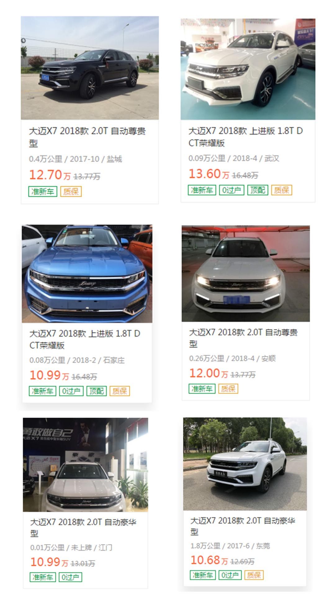 再来,我们也可以从这些车的二手市场来分析,以众泰大迈X7为例,猛一看,这车的价格都挺高,说明保值率不错嘛,但是再看回行驶里程就知道,几乎都是开了几千公里的就换车,是时代发展太快,大家都发财了吗?这么快换车,但是仔细一分析却很值得耐人寻味啊!
