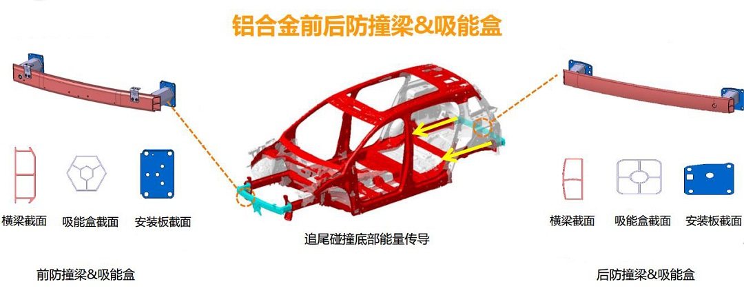而在吸能设计上,前后防撞梁均采用铝合金材质,并配有吸能盒,其实最大的作用也就是作为应对低速状态下的小碰撞事故。