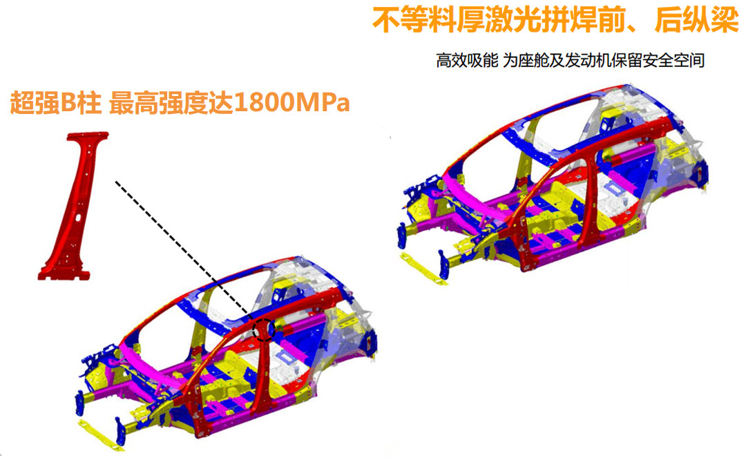 而在一些焊接工艺和其他方面,前、后纵梁采用先进的激光拼焊技术,多种厚度、多种强度钢板激光拼焊而成,一个零件兼具吸能与支撑两种作用;用5420个高密度焊点打造无缝盔甲;还有超高强度的B柱,最高采用 1800MPa超高强度热冲压成型钢板。