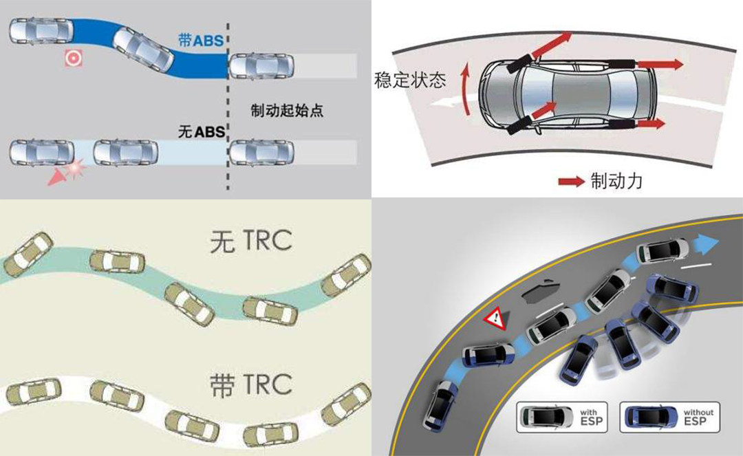 除了被动安全以外,最后就是主动安全方面了,而这一部分就主要体现在配置上了,选车的时候,看配置表一目了然,像现如今比较基础的配置就是ABS防抱死、EBD制动力分配、TCS牵引力控制、还有就是比较重要的ESP电子车身稳定系统。