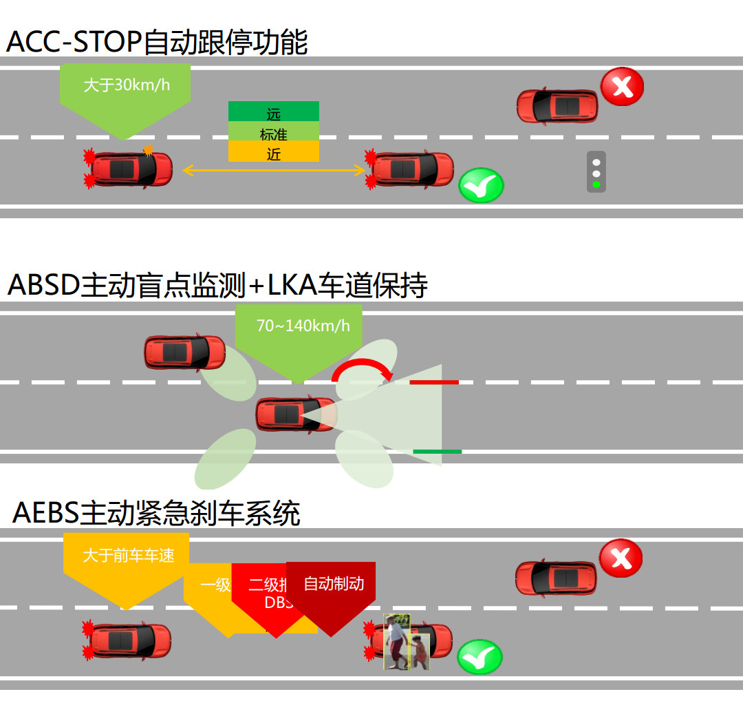 像一般的家用车,以SUV天逸为例,它用的是博世9.1代ESP电子稳定系统,TPMS智能胎压监测系统,还有多达12项ADAS驾驶辅助系统,包括各种雷达、传感器等,像一些相对有档次的安全配置它都会有配备,例如ACC-STOP自动跟停功能、ABSD主动盲点监测+LKA车道保持、AEBS主动紧急刹车系统等,所以如果你买车,看这款车主动安全性能如何,看这些安全配置就可以了。