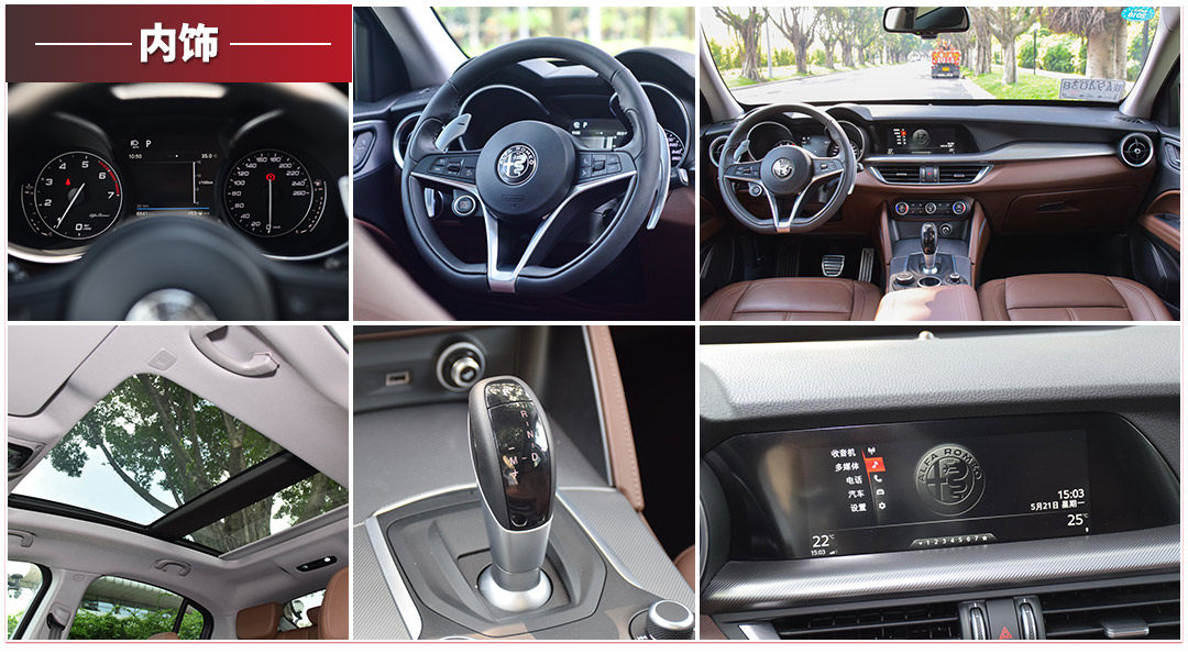 Stelvio的内饰造型相对简单,拼色的内饰能够很好地表达出内饰的层次感。内饰造型的简单带来人机交互也相对简单的好处,Stelvio的中控屏,方向盘多功能按键的操作逻辑简单,易上手,熟悉之后盲操没什么问题。Stelvio的方向盘背后有两块硕大的换挡拨片。当你想要操作方向盘背后的拨杆,这两块拨片就很碍事了。Stelvio上还配备了前半段可开启的全景天窗。就整体而言,Stelvio的内饰简单,但是用料方面还是能够给到一台豪华品牌车型应有的水准。