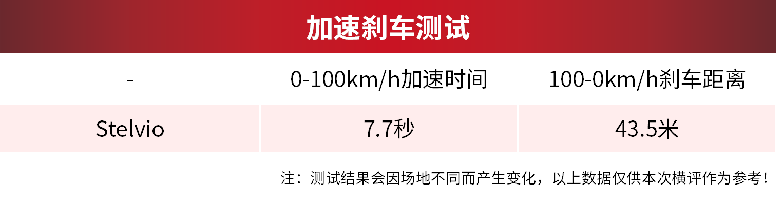 Stelvio的刹车成绩就不太好看了,43.5米的刹车成绩谈不上优秀,而且ABS触发也比别家容易一些。归根结底,还是Stelvio的四条轮胎抓地力有点弱,相信更换轮胎后,Stelvio的表现能够更好。