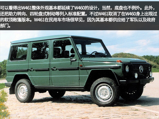 1991年,奔驰G-Wagen W461面世,其是基于W460改进而来的,不过与W460不同的是,W461是主攻军队以及政府等机构特种用途用车。