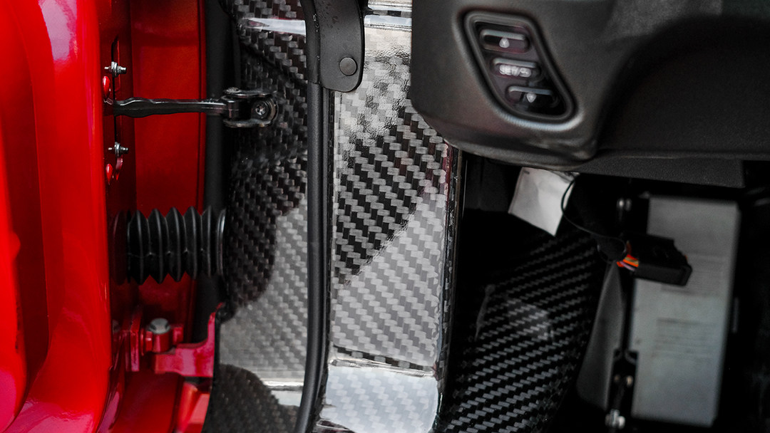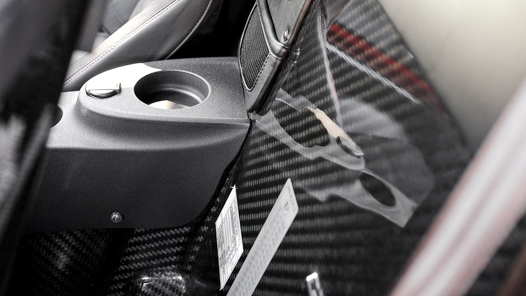 除了外观以外,整车采用尽量少的隔音材料。座椅直接装在碳纤维单体壳上,没有任何的地毯等舒适性材料。连手动调节的座椅也尽量做得更薄。舒适配置方面,除了手动空调、电动窗和和收音机,也就没有再多的。由此获得了整车不到900公斤的净车重,一切都为了性能服务。
