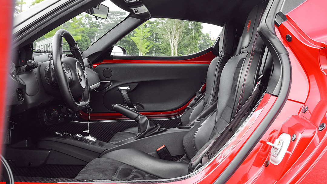 作为一台合法上路的“赛车”,性能就是关键。4C的车长为3989mm,比飞度更短。但轴距为2380mm,等于四个车轮尽量接近车辆四个角,前后悬长尽量短,让车身的旋转惯量更小,以获得更灵敏的反应。车宽则达到了2090mm,四个车轮的布局几乎接近于一个正方形,横向稳定性非常高同时也保证了极端的灵敏。悬挂方面,前双摇臂的设计能够提供更强的横向刚性,而后悬挂为了避开引擎部分,采用了结构较简单的麦弗逊设计。