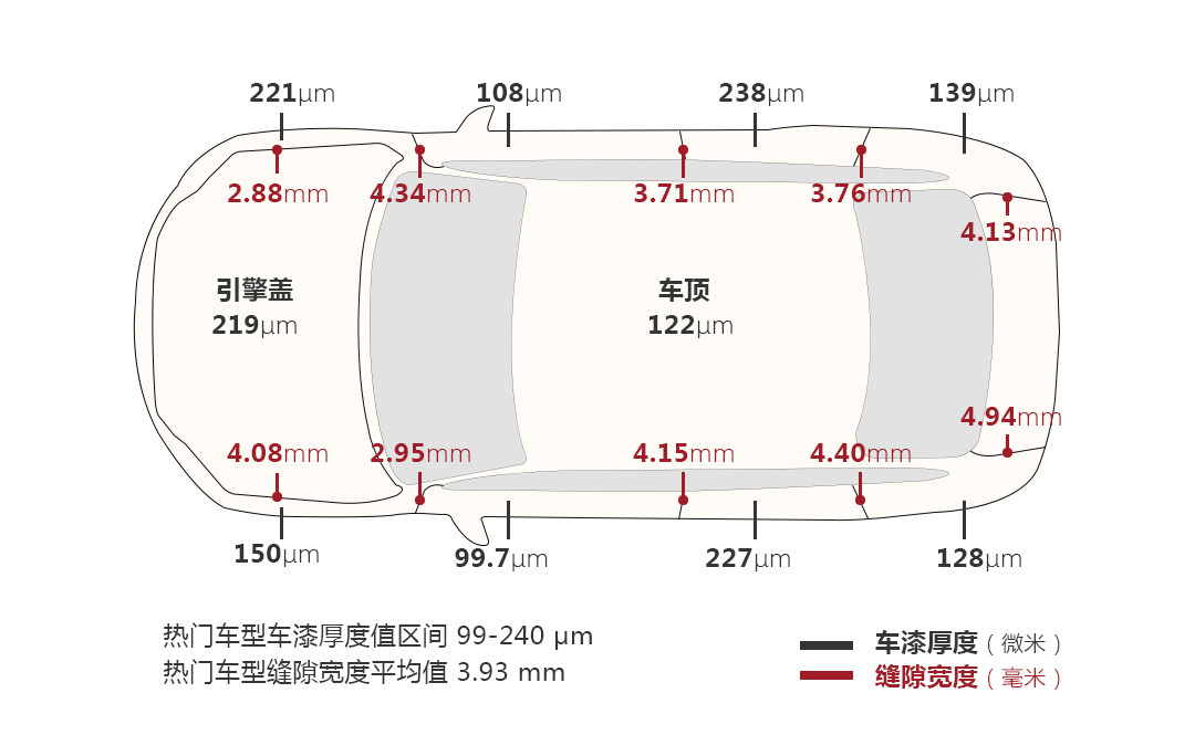 F-PACE在漆厚均匀度和拼接接缝方面交出尚算满意的答卷,整体表现达到豪车应有水准,不排除试驾车型遭碰刮后重新补漆(99.7μm、108μm处)。