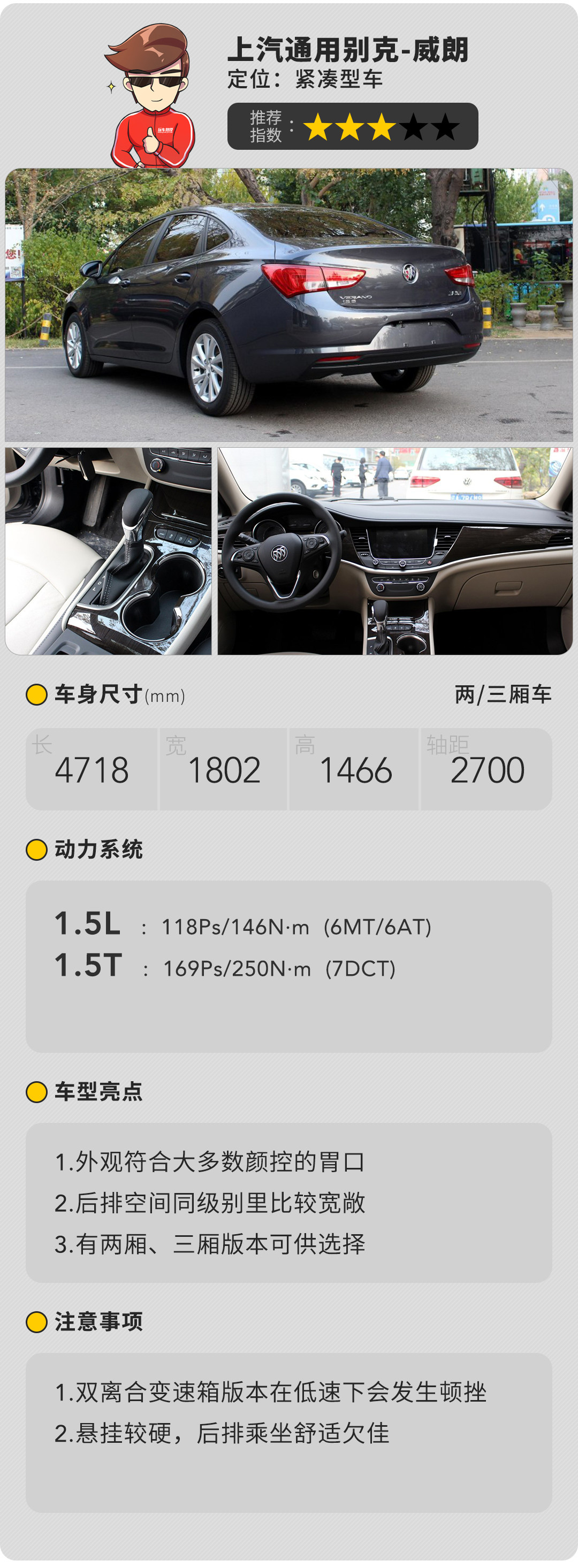 威朗在同级别车型中一直有着不错的表现,外观时尚大气、内饰豪华感十足,别克在内饰高级营造上很明白中国消费者需要什么。配置丰富贴心,让威朗在消费者中取得不错的口碑。但威朗也具有美系车通用的缺点,油耗比较高,另外变速箱也有顿挫的问题。