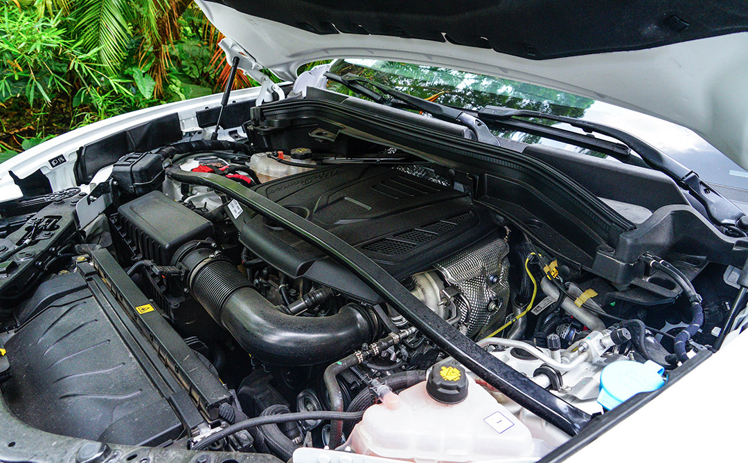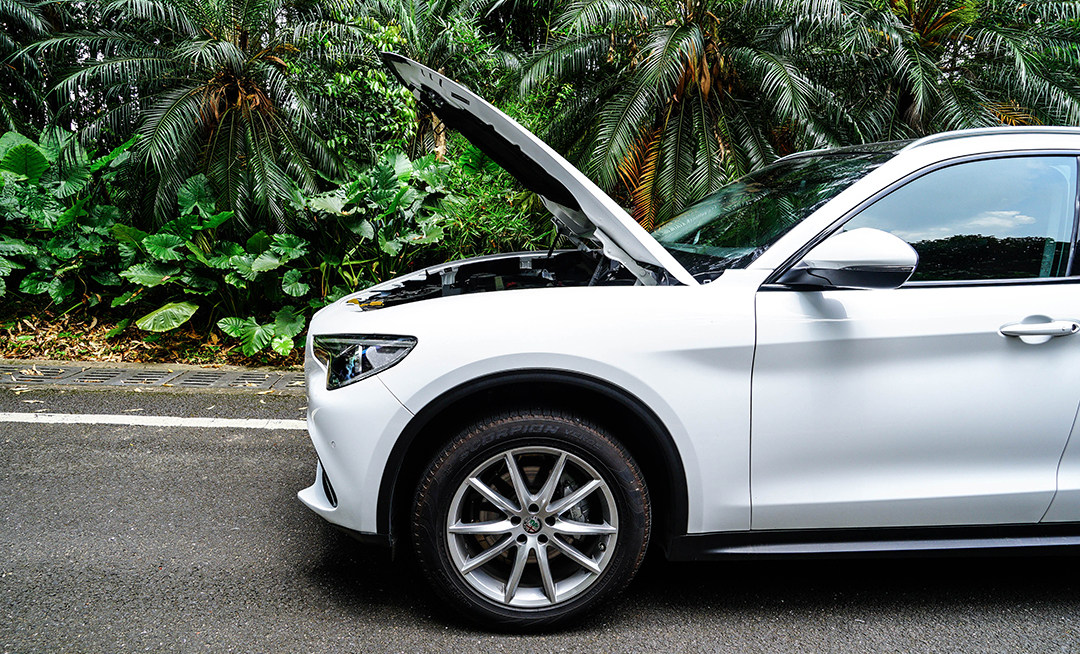 打开Stelvio的发动机舱,我们除了能够见到较粗的稳定杆,还会发现纵置的四缸发动机被安放在了前轴靠后的位置,所以这是具“前中置”布局的发动机,这样设计得以让Stelvio的前后配重更均匀。