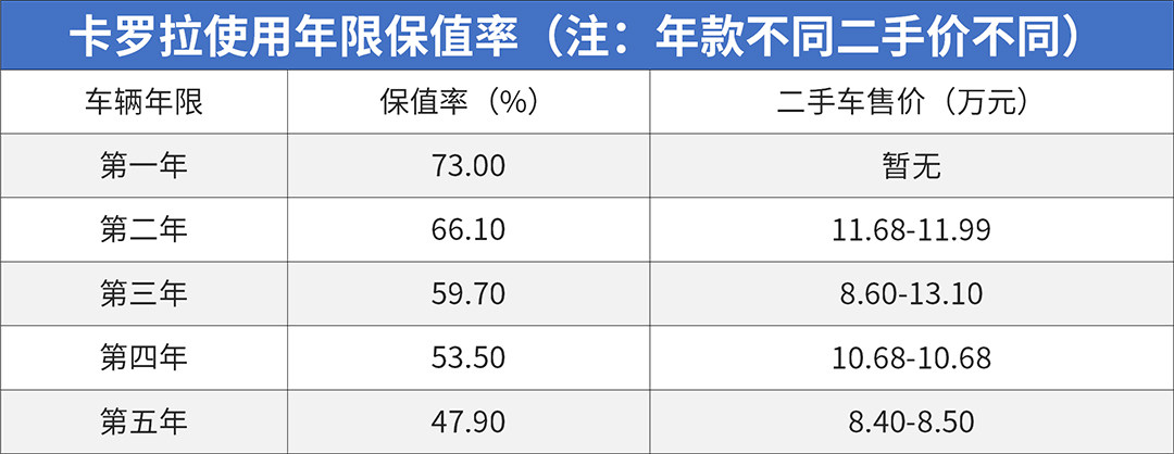 从二手车市场行情来看,丰田卡罗拉的保值率还是比较不错的,开3年后的保值率仍有59.70%,即使买二手车回来开2年后保值率还有47.90%,再次转手仍能卖个好价钱。