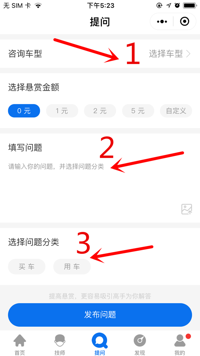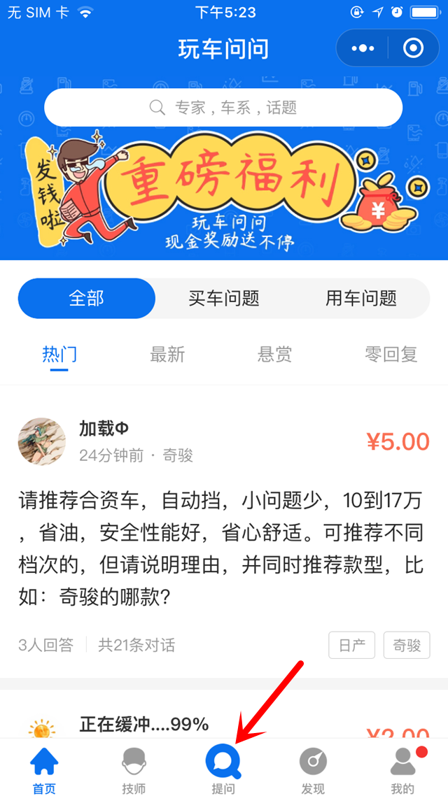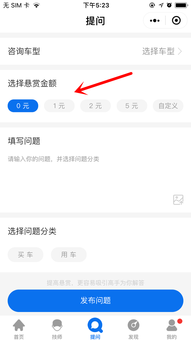 是不是有很多买车问题想咨询呢?回到首页,点击下方中间“问答”按钮即可到达提问页面,还不赶紧尝试一下?