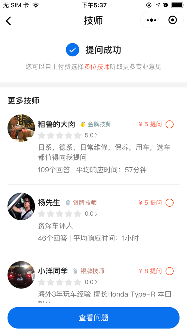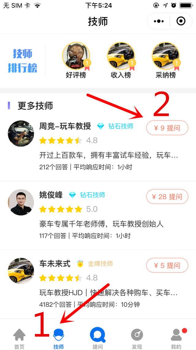 点击“技师”一栏,根据每位技师的强项、金额,挑选自己满意的技师进行提问,点击该名技师右边金额按钮,向他咨询