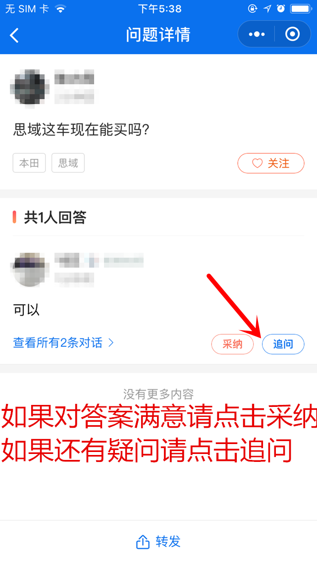 当有人回复时,如对问题还有疑问可以点击【追问】按钮。