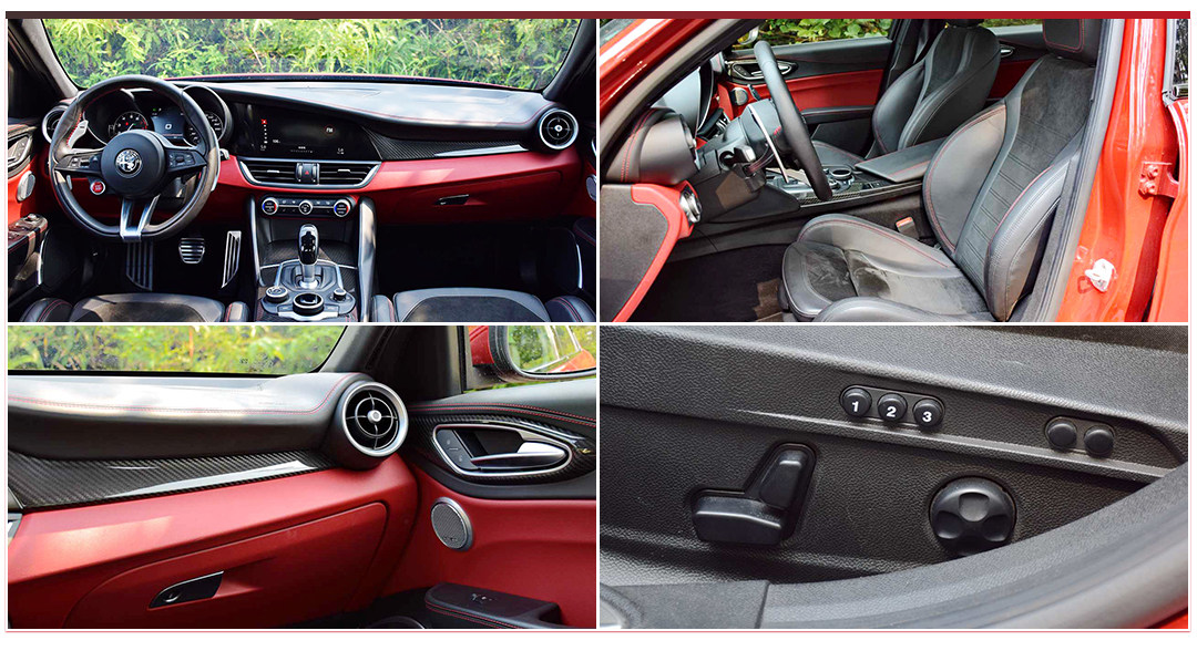 Giulia Quadrifoglio的座椅可以调得很低,并且包裹性很强,在你激烈驾驶的时候,能够有效控制你身体的倾侧,给你一个更加安定的姿势去操控车辆,如果嫌标配座椅不好,可以选装碳纤维外壳的更加激进的座椅。