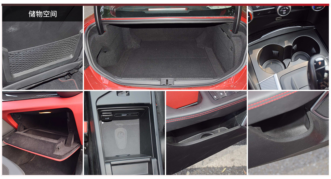 Giulia Quadrifoglio的储物空间可以用拮据来形容,前排储物格除了两侧门板,手套箱和扶手箱以外,再无其他储物空间,后备箱空间规整,虽然不能放倒后排座椅来加大装载容积,但后备箱放两条P ZERO CORSA用于下赛道也足够。