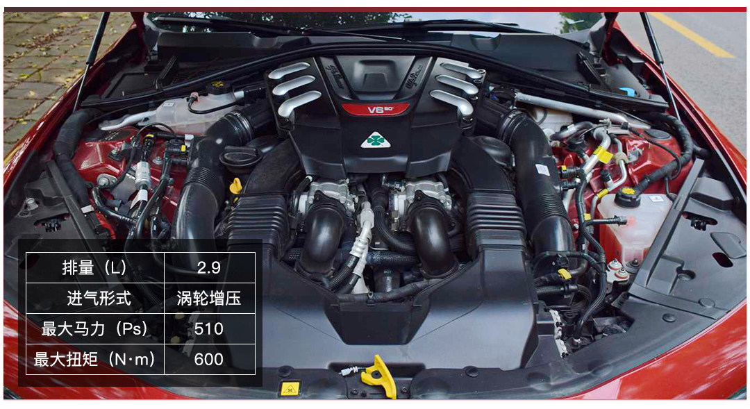 说道发动机,传承至鼎鼎大名的法拉利F154,3.9T发动机,割舍两个气缸以后,2.9T,90°夹角的V6发动机,两个来自IHI的涡轮,内部大量的锻造部件都是Giulia Quadrifoglio的谈资。仅需要92号汽油,这台发动机就可以爆发出510Ps,600N*m的动力。