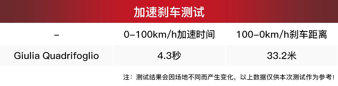 由于测试当日的气温达到36℃,最终0-100km/h加速时间为4.3S,距离官方的3.9S还有一点差距,刹车成绩在高温的天气下凭借强大的刹车力度和不错的轮胎抓地力保持在33.2米,成绩优秀!