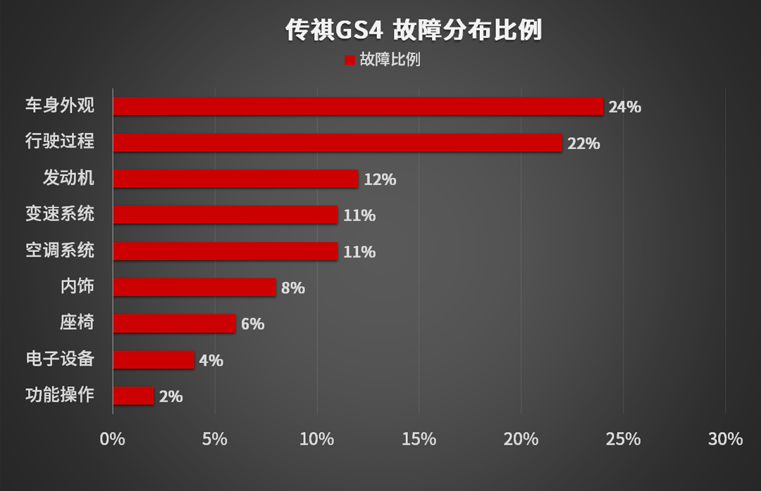不过相比之下传祺GS4的售价并不算很亲民,而且新车百车故障数为368(该级别均值为283),问题主要集中在以下方面: