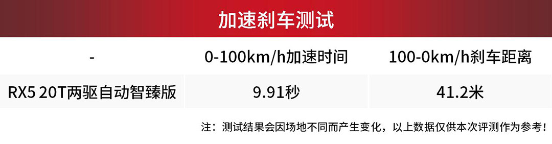 经过测试,这台RX5 20T自动互联网智臻版的0-100km/h加速成绩为9.91秒,这个成绩对于一台搭载1.5T发动机的国产紧凑型SUV来说已经很不错了;在起步瞬间RX5没有出现明显的抬头现象,车身姿态非常平稳。而在制动测试中,RX5的点头现象比较明显,车身明显前倾,不过41.2米的100km/h-0制动成绩也达到了预期。