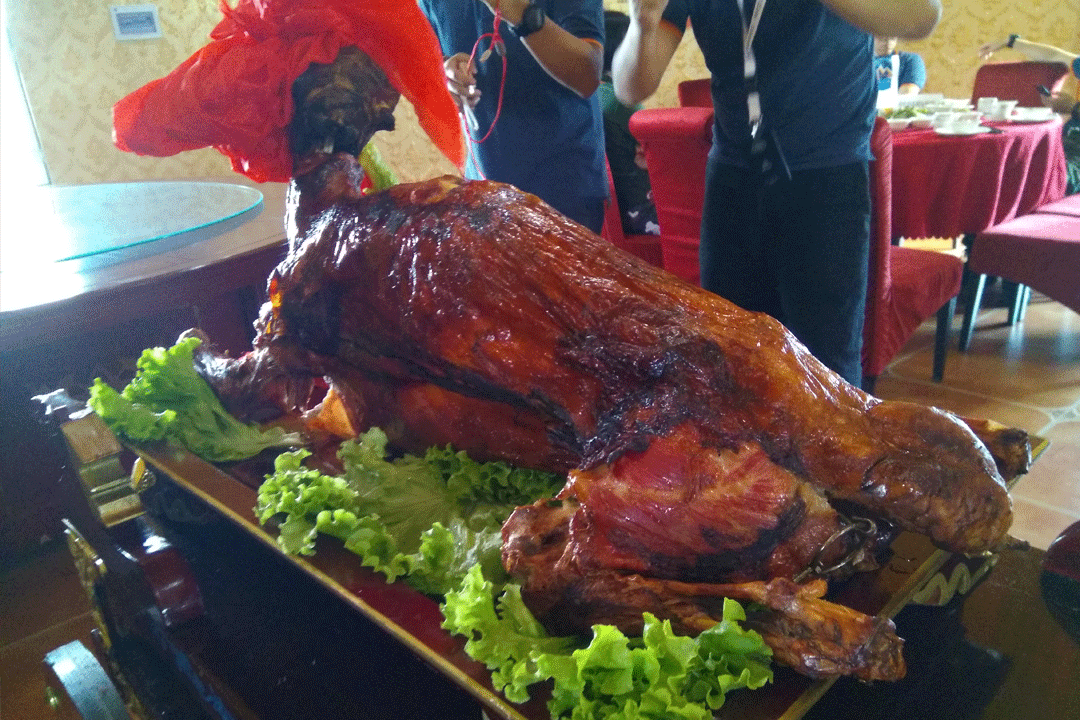 接着教授一行人驱车额尔古纳弘吉刺部,这里的主人家为我们提供了类似蒙古包的酒店房间还用蒙古的国宴烤全羊以及许多美食招待我们,烤全羊的肉质更嫩也更多肉汁,比分开烤的养好不少!