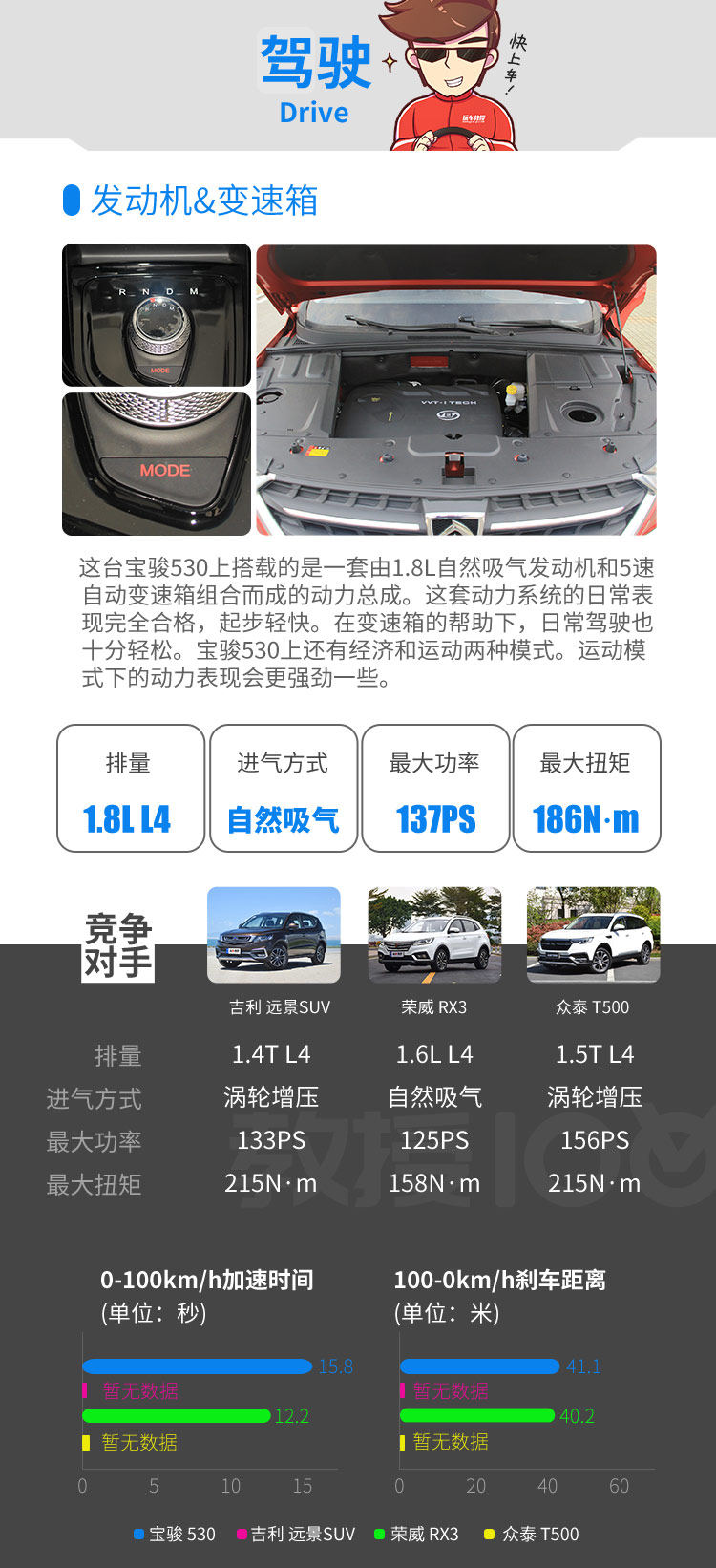 总结:宝骏530刚推出不久后,就成了SUV销量前十榜单的常客。在其他厂家还在苦恼如何把价格做低的时候,宝骏已经完成了自身的革命,变得更加时尚,更加精致。宝骏530的外形内饰设计在同级中,算得上非常优秀的产品。在驾驶性能方面,宝骏530能满足日常代步的需求。宝骏530的维修保养也相当便宜。非常适合国内大部分群众的选车要求。