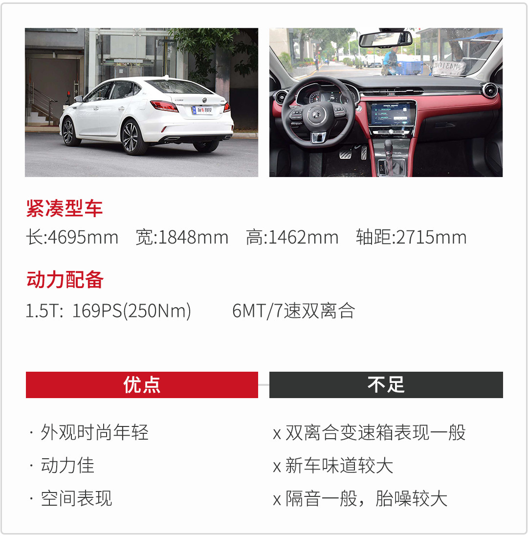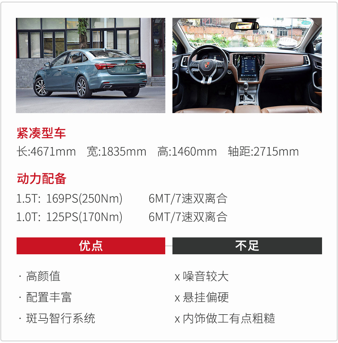 荣威i6的外观设计比例十分协调, 家族式的前脸足够的稳重,“律动设计”的理念在把整个车子简洁化的同时又不失时尚与动感,无论是前脸侧面,再到尾部,看上去非常和谐顺眼,相信这个车子在过几年也不会显得过时。 荣威i6搭载1.0T和1.5T两款发动机,匹配6速手动变速箱或7速双离合变速箱。