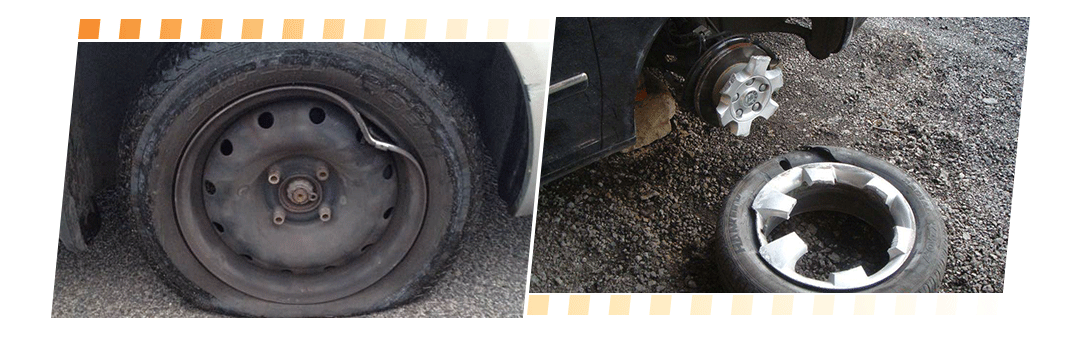 受到超限外力冲击后的钢轮圈(左)会变形,而铝合金轮圈(右)会断裂报废