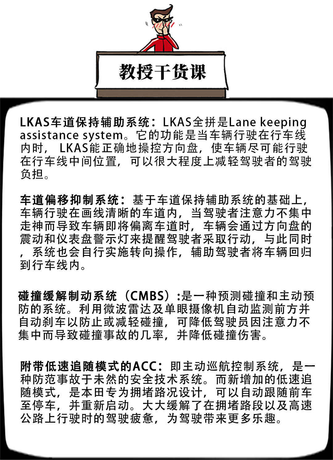 ▲Honda SENSING包括了车道保持辅助系统(LKAS)、碰撞缓解制动系统(CMBS)、车道偏移抑制系统、附带低速追随模式的ACC等主动驾驶安全辅助功能