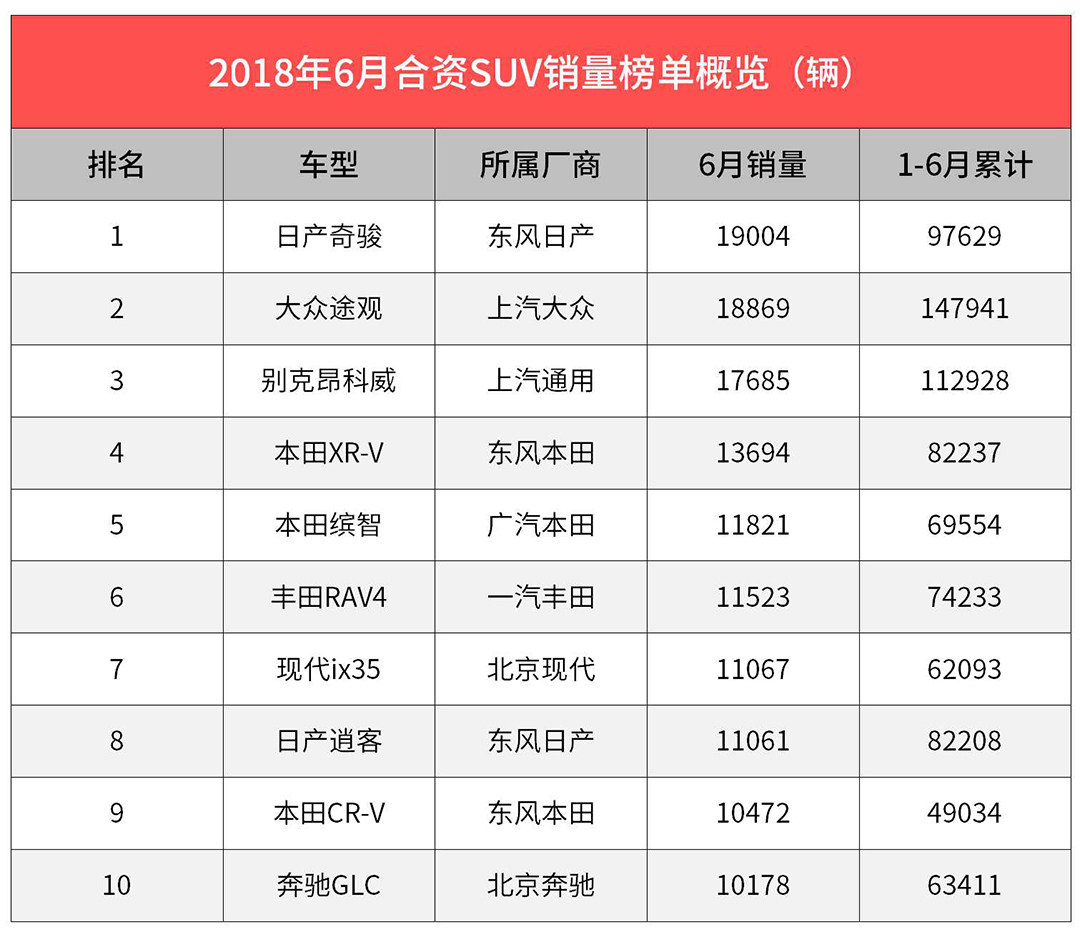 六月份SUV增长量进一步放缓,与五月份相比,上个月SUV销量榜前十名的车型销量整体呈现出一定下滑态势,仅有三款车型销量破两万,前三位依旧让自主品牌三车型占据,奇骏力压途观,成为销量最高的合资品牌SUV车型。