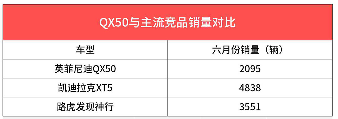 全新QX50在六月十号上市,大半个月的时间交出2095辆的销量数据,这个数据对于QX50来说尚可接受,通常说的“二线豪华品牌”英菲尼迪的品牌效应也属于并不高的类型,能有两千多的数据已经算是及格。