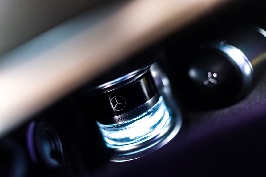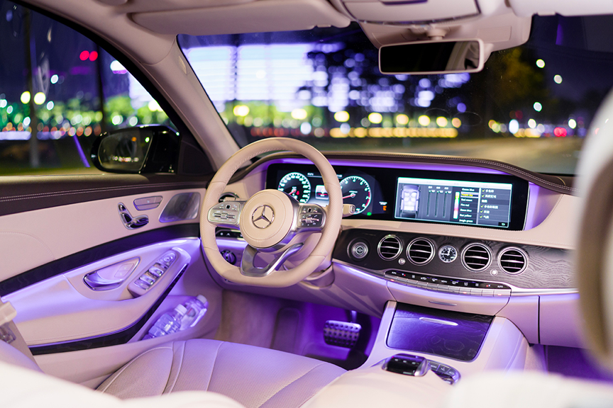 视、听、嗅、触觉的四位一体,是梅赛德斯-奔驰对境界的理解。深色多疤胡桃木和Nappa真皮包裹搭建了车内氛围的主基调,搭配打造出天籁般的Burmester®之音,辅以芬芳怡人的由车内空气调节组件散发的香味,加之64色氛围照明的流光溢彩,为成就者提供的是尊享非凡的驾乘空间。