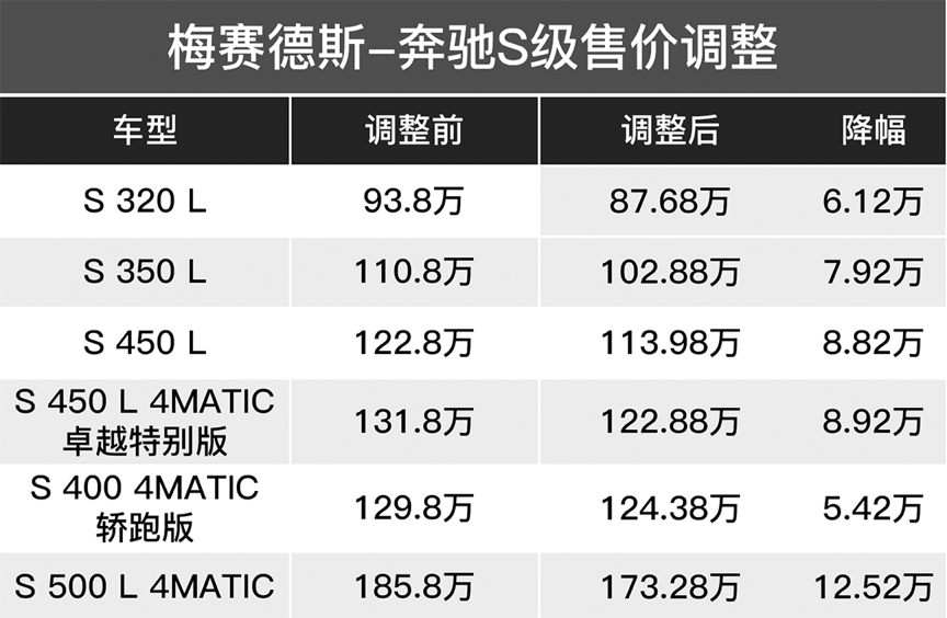 其中,梅赛德斯-奔驰S级的售价调整情况如下,除AMG及迈巴赫外,S级全系降价幅度为6.12万——12.52万不等。