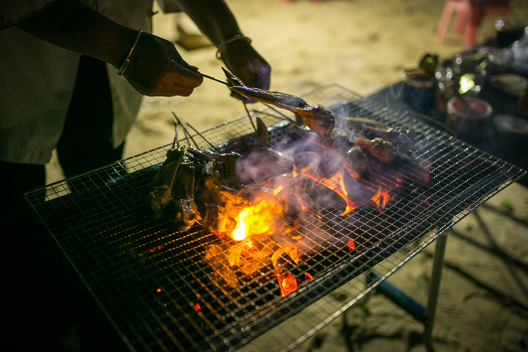这场景让我想起了《向往的生活》,黄磊何炅他们坐在院子里边吃饭边聊天,我们同样有个装扮有彩灯的小棚子,同样一张大桌子,同样一群人围着坐,不过我们是在海边哟~