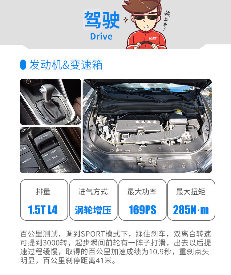 驾驶方面,开起来难免会觉得1.5T起步是比较肉的,毕竟车重超过1.5吨,需要把转速提到2000转以上才算有点灵活,到中后段是比较线性,力气终于上来了。