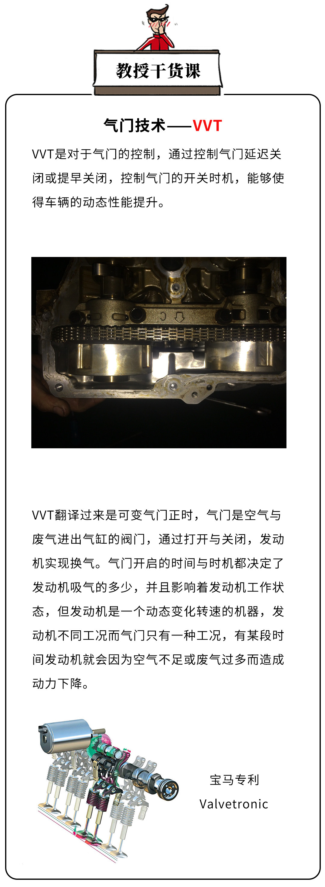 可变气门就是为了解决这个问题而出现,VVT通过液压或者电控马达改变气门开启的时机,从而提升动力以及降低油耗,上图是宝马的电控可变气门技术,通过电机改变气门的扬程,达到更加精确的控制。
