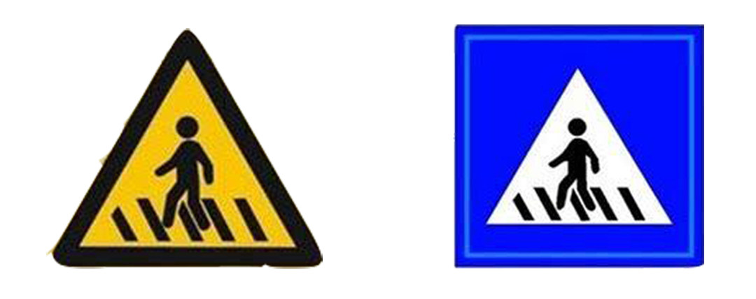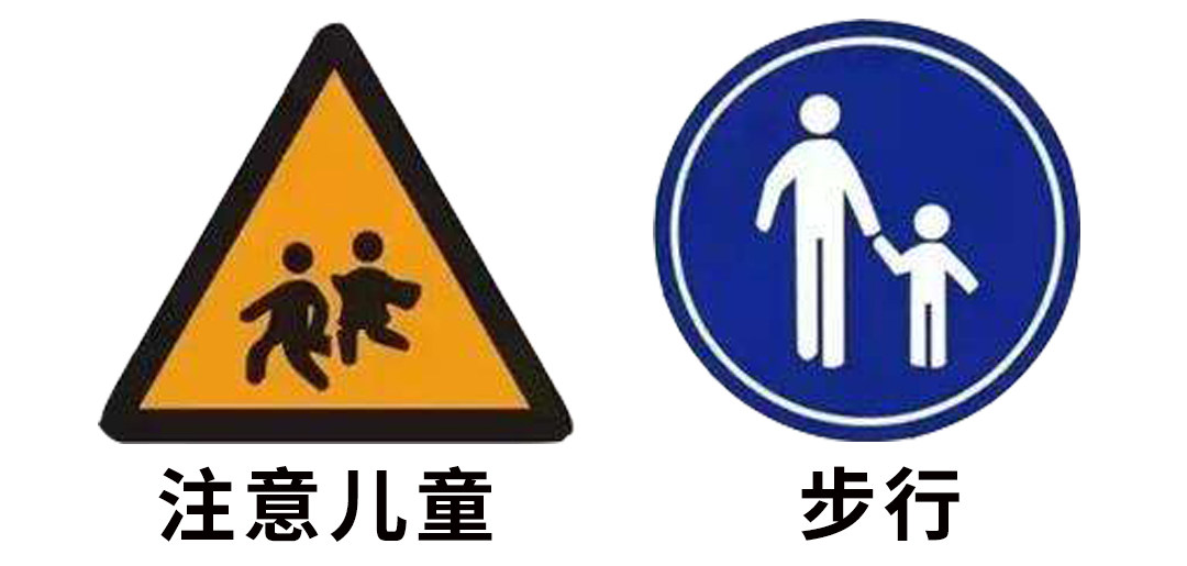 对于这两个图标教授采用的是颜色区分法,黄色在交规中通常表示警告,如果是黄色底那肯定是表示注意儿童;若为白色底,那就是步行了。