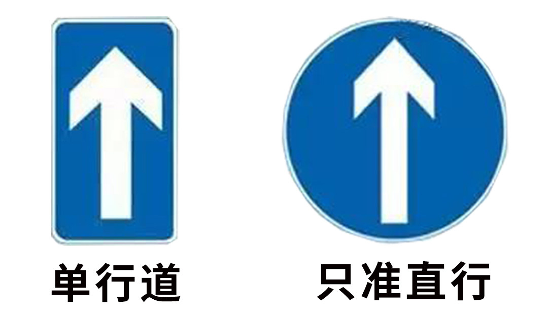 这两幅图颜色和箭头都一致,就是形状不相同。方形的表示只可以单方向行驶,不能逆向行驶,而圆形图标代表的意思是只可以直行,不能进行左转右转等操作。