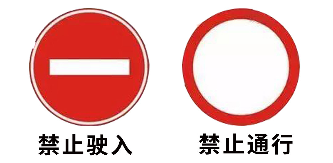 虽然两个禁令图标都是红白相间型,但是两者所表达的意思是完全相反的。红底带横杠表示的意思是禁止驶入,通常它所针对的是单行道路,纯白底图标表示的意思是禁止通行,意思就是无论是行人还是车辆都不能从这里通行。